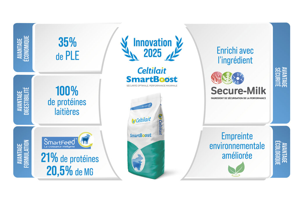 Avec 35 % de poudre de lait écrémé et 100 % de protéines laitières, Celtilait SMARTBOOST™ assure une assimilation optimale des nutriments, tout en maîtrisant les coûts d’alimentation.